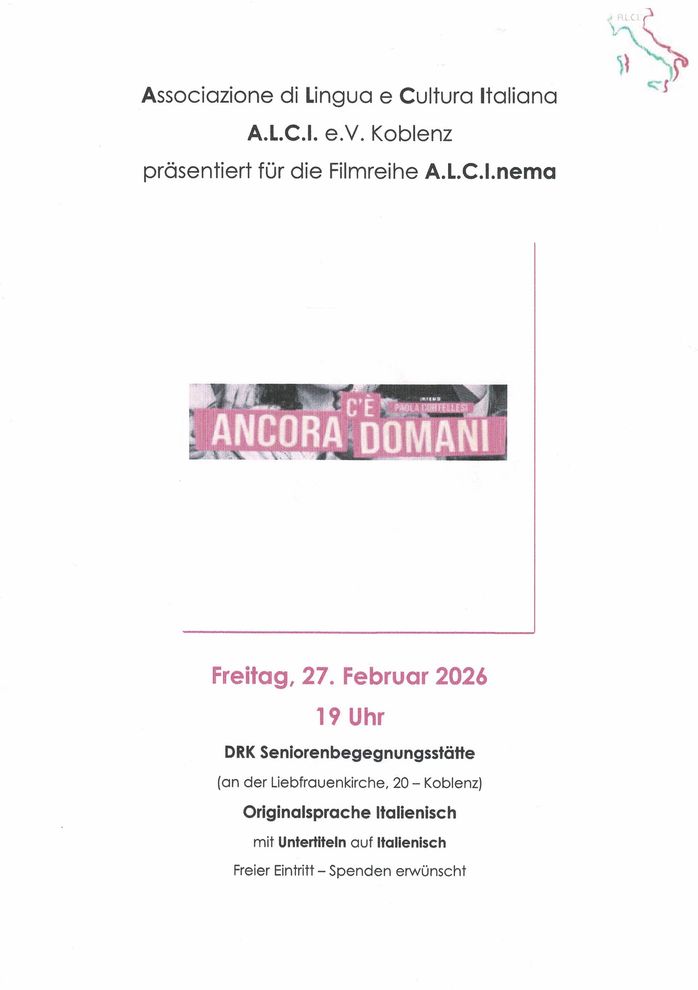 Come ogni anno Vi proponiamo di partecipare all'Assemblea Annuale dei Soci dell'A.L.C.I. e.V. che si terrà in data 8 maggio 2026 alle ore 19:00 alla DRK Haus der Begegnung, An der Liebfrauenkirche 20, centro storico di Koblenz.